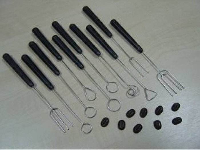 Комплект приладів для обмакувания і глазурування в шоколаді трюфелів, праліне, фруктів і сухофруктів. Завдяки різній формі вилок можна зручно вмочати різного виду вироби і продукти.
